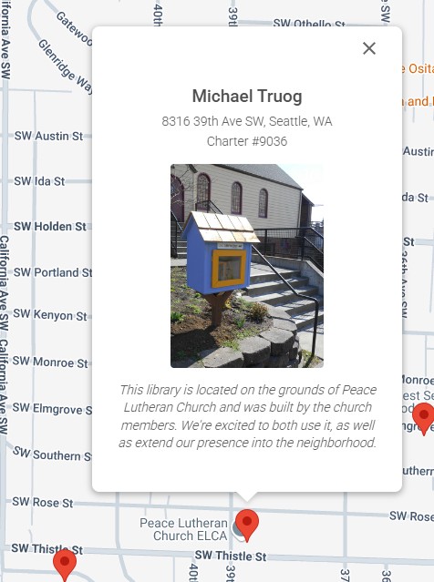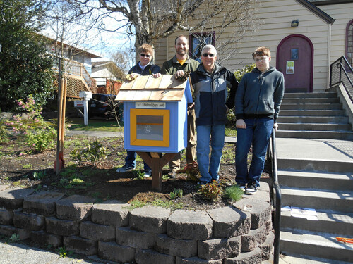 Peace Lutheran Church of West Seattle hosts a Little Free Library on the Thistle side of the church, next to the sidewalk. Photo of the 2013 installation crew for the Peace Luther Church Little Free Library